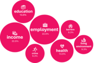 The IMD25 combines information from seven areas, known as domains, of people's lives: income, employment, health, education, housing, crime and the living environment. These are weighted and brought together to give an overall score, their contribution is shown on the bubble plot. You can also look at each domain separately to see what is driving deprivation in a particular area.
